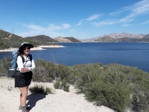 The trail crossed under Cedar Springs Dam, then climbed above Silverwood Lake. We enjoyed the view of blue water and sandy beaches for several miles, mostly high above, once dipping very near the water.