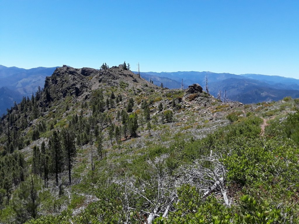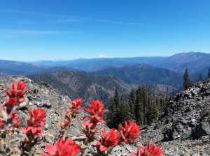 The lovely thing about a huge climb is being on top. The spine of the Siskiyou Mtns holds our path today. Flowers galore! Bird songs everywhere! Sunshine, cool breeze, blue sky, tall evergreens! The world is a wondrous place, and today I am devoutly thankful to be here, surrounded by nature!
