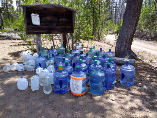The importance of water is a lesson the PCT teaches again and again. Though this area boasts of many ponds, lakes, streams, and springs, the actual trail tends to stick to the tops of ridges, making for a very dry walk with steep side trips to fetch life-giving liquid. Thus, you can imagine our delight and appreciation this morning when we came across a water cache left by a trail angel named Devilfish.