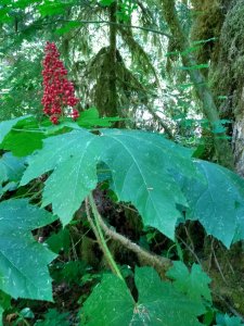 Thimble berries, sparsely scattered through the forest, were delicious!Twisted stalk was a new plant to me. My good friend, Wikipedia, informed me that eating too many of the berries could have a laxative effect. I was glad I had not tried them!Smooth sumac also did not look edible to me. Wikipedia later told me that a drink high in vitamin C could be made from the berries. However, it is ALWAYS good to err on the side of caution when it comes to eating wild foods.I was delighted to see salal berries. I first ate them as a teenager, and it has been decades since I’ve had the pleasure of their subtle sweetness.Blueberries! Sweet, tart, juicy, fortifying!Queen’s cup, in the lily family, is a favorite food of ruffed grouse, but not edible to humans according to the US Forest Service.We also found the queen’s cup lily still in bloom at higher elevations.Devil’s club, used as medicine and for spiritual purposes by Native Americans, grows very slowly and is mostly found in old growth forests.The gold and red mottled berries of false Solomon’s seal are beautiful, but not edible to my knowledge.Salmonberries are a thirst-quenching treat on a hot day!Yummy!!As Jay and I walked through a fairly recent clear-cut, we found a sizeable crop of mountain blackberries, rubus ursinus, begging to be picked! These berries are much sweeter and smaller than their more numerous Himalayan cousins!Purple huckleberries, the sweetest berry in the forest!I was delighted to find one bush of red huckleberries! These can be easily confused with the red baneberry and other poisonous red berries, so don’t eat them unless you are sure!Red baneberry. Very poisonous!Oregon grapes are edible, but should be eaten with restraint. Too many can cause an upset stomach.