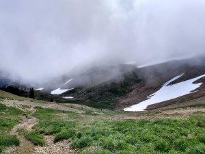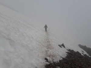 At the top of the snow field, we met Lazarus from Cambridge, England, and Sonia from Seattle, WA. Sonia was a bit nervous about our route, climbing 1600 feet into Goat Rocks, walking along the top of a ridge known infamously as “the knife edge”. The wind had picked up a bit, turning rainy mist into horizontal mist.