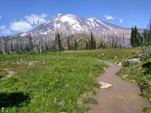 “Oh!” I exclaimed, my shoulders sagging in disappointment. “We can’t drink this! It must be coming from a glacier on Mt Adams.” I consulted the map. “The next water source is Riley Creek, 4.5 miles away. It looks like it comes from Mt Adams also. What if all the creeks are full of glacial silt?”