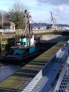 A tugboat pushed a barge full of gravel through the Ballard (Hiram M. Chittenden) Locks, much to our delight.