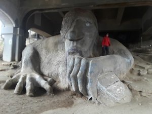 The Fremont Troll, one of the better known denizens of the city, lurked beneath a bridge.