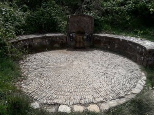 Back on the Camino, we climbed steadily until suddenly coming upon a fountain, with stone benches and a beautiful design of sunshine rays painstakingly made from small river rocks. Jay read the Legend of Fuente Reniega from his guidebook. According to legend, a pilgrim, after resisting the temptations of the devil, was rewarded with a vision of Santiago himself, who led the pilgrim to this fountain and gave him water using his own scallop shell!