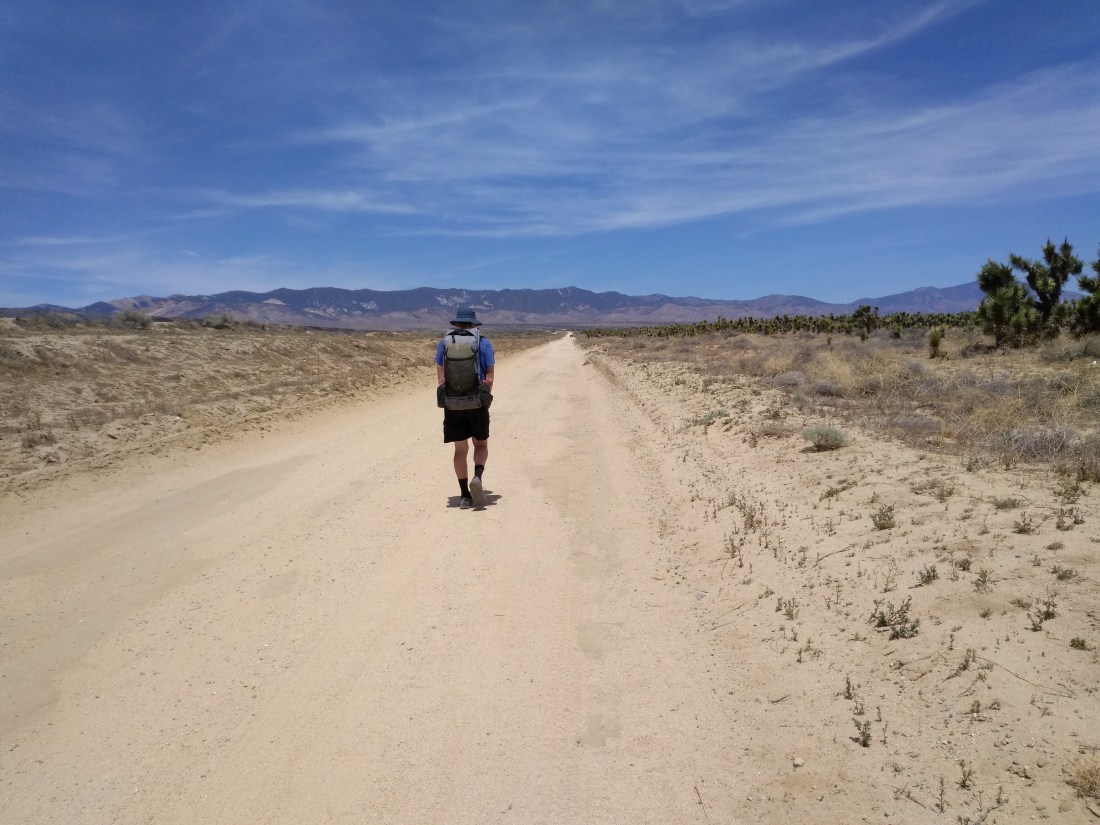 Many hikers complain of the boredom of this day’s hike. I admit, I wouldn’t want to cross this valley every day. But after days of winding through hills and mountains, the novelty of flat and straight entertained me for hours. This picture shows Joshua trees on Jay’s right.