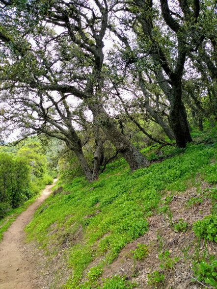 Gray sky put a definite tinge of humidity in the cold, early morning breeze. The trail wound around the sides of hills, occasionally crossing a ridge top, sometimes diving through an oak grove. Poodle dog bush and poison oak abounded, slowing our progress often as we stepped carefully to avoid these plants.