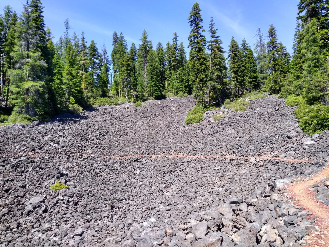 After lunch, I had the excitement of hiking around Brown Mountain, a small cinder cone on top of a shield volcano. The path passed from tall trees sporting streamers of usnea to blocks of hardened black lava devoid of vegetation. Such a fascinating ecosystem! As I gratefully hiked along the carefully constructed path, I marveled at the amount of work the trail crews had lavished on these lava crossings. Without the trail, my forward progress would have made a snail look speedy, and I would have probably broken a leg!