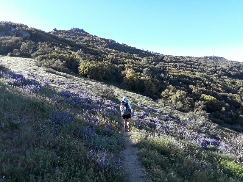 This afternoon, as the vegetation changed from high desert scrub to live oaks and pines, we walked across several hillsides covered in purple lupines. The scent of warm grape cool-aid surrounded us. What an experience, to be enveloped in scent and purple beauty! Jay used a flower app called California Wildflowers to find the name of these aromatic beauties.