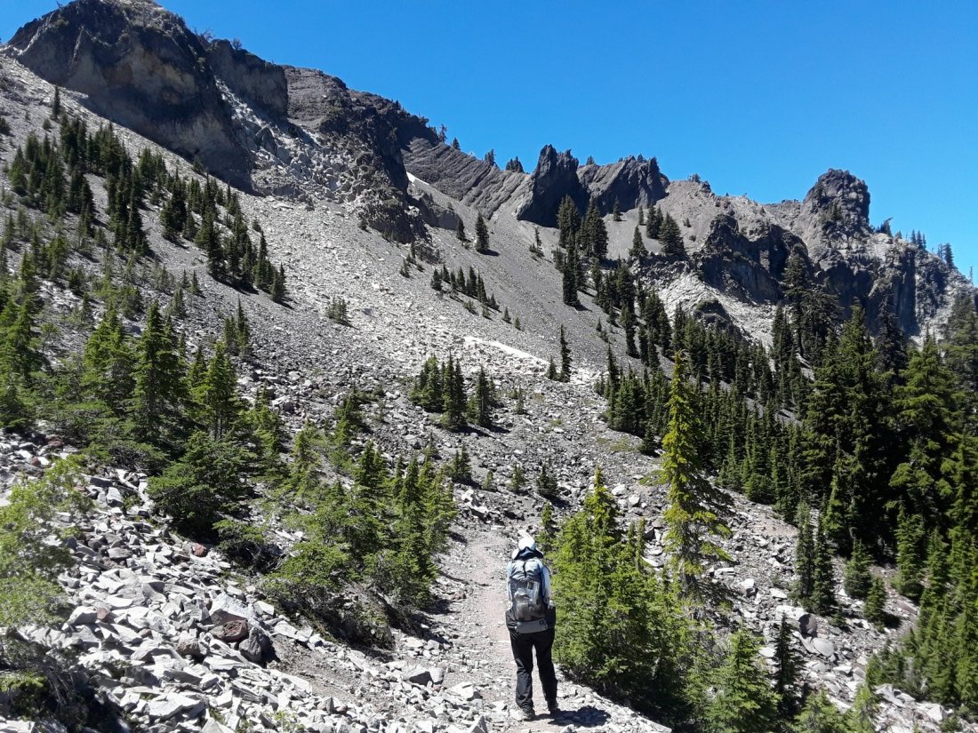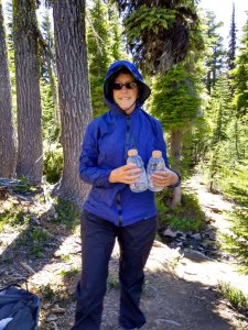 We came to a side trail for Devil’s Peak. The top looked so close, we couldn’t resist dropping our packs to climb. Another couple with the same goal took our picture before we started. The view was well worth the effort. Mt McLoughlin and far off Mt Shasta greeted us from behind, Klamath Lake lay on our right, a wilderness of jumbled green ridges stretched out on our left, and the rim of Crater Lake loomed before us.