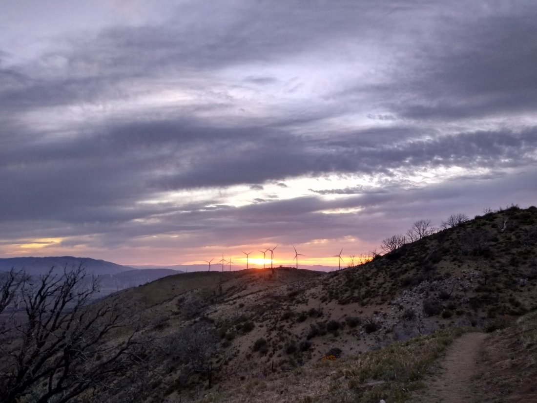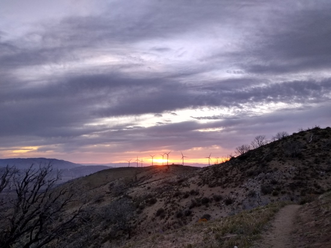 After climbing over 2,000 feet in the course of 12.7 miles, I was glad to see evening shadows bringing the peace of a campsite. We camped under a live oak tree on the edge of a meadow, with a ridge of wind turbines just beyond. Once again an owl sounded a lullaby as I fell asleep.
